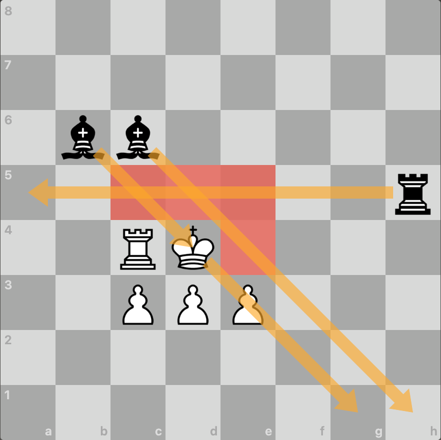 The diagram below shows a king which is in check from two opposition bishops and a rook, and there are no safe (green) squares to move to. This is checkmate and the safe (green) squares he can move to to get out of check and the unsafe (red) squares he is not allowed to move to.