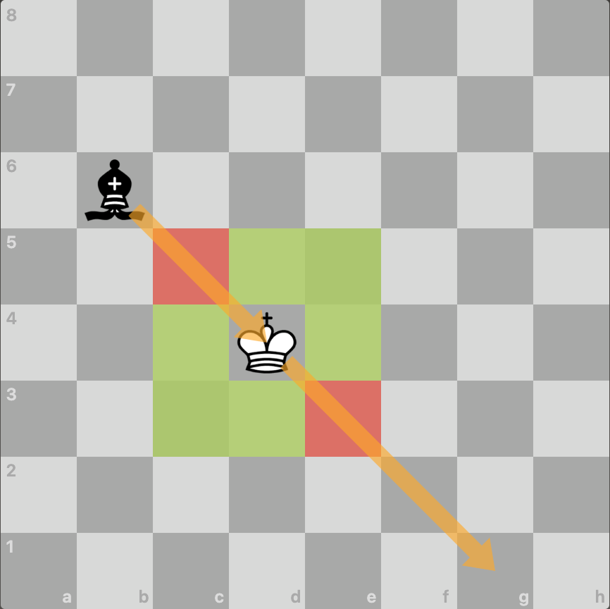 The diagram below shows a king which is in check from an opposition bishop, and the safe (green) squares he can move to to get out of check and the unsafe (red) squares he is not allowed to move to.